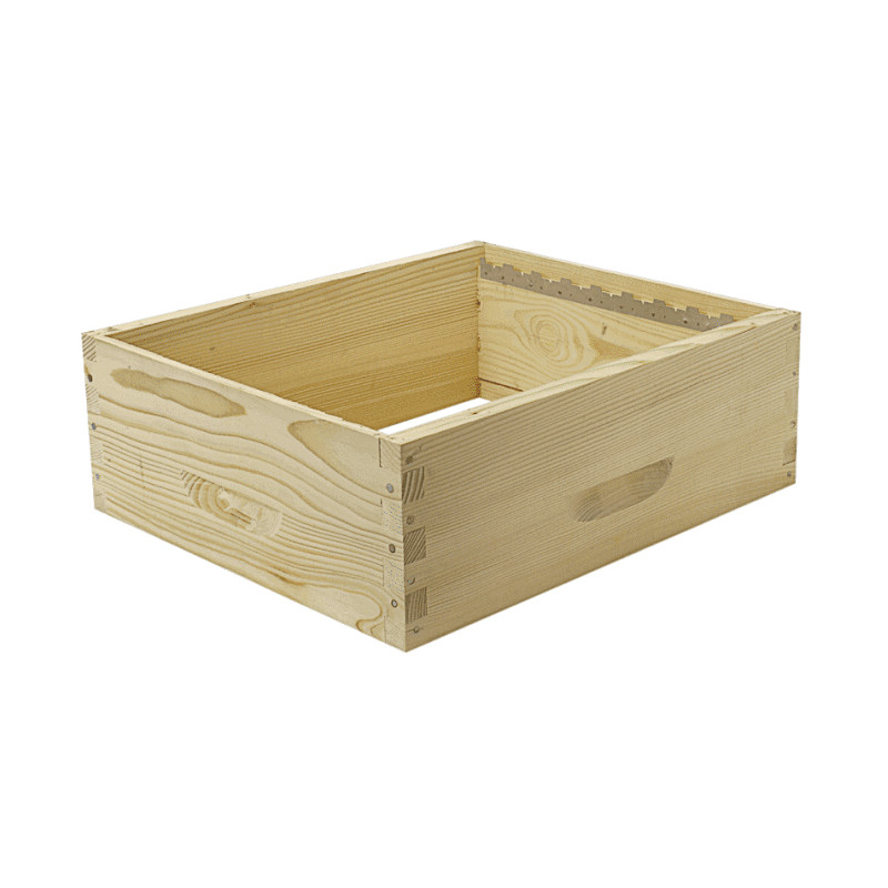 La hausse de ruche à tenons Dadant 11 cadres "Made In France" est composée de crémaillères posées et d'une bande inter-cadres non posée.